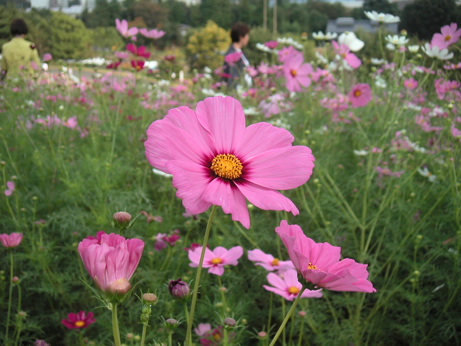 コスモスの咲く道歩くおばあさん・・・(⌒▽⌒)アハハ!